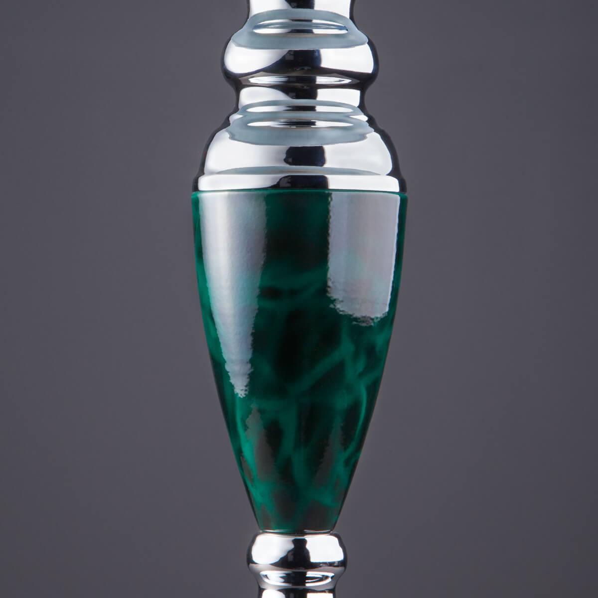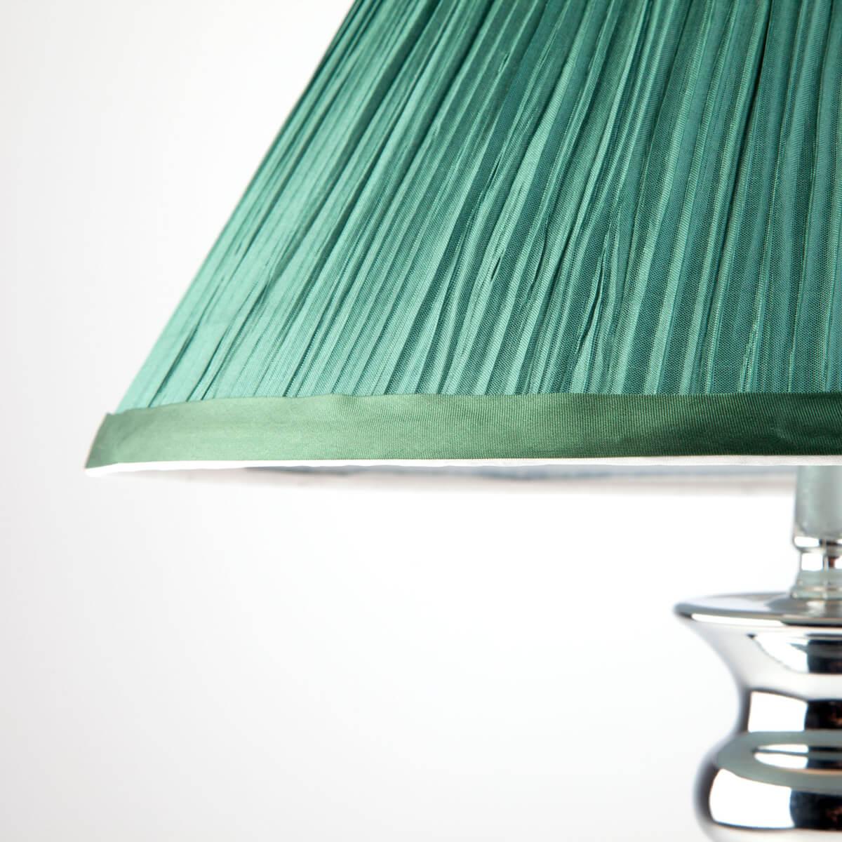 Настольная лампа Eurosvet 008/1T GR от Китайского бренда из коллекции Majorka ) подходит для установки на стол в гостиной в стиле Арт-деко. Лампа из металлической основы - цвет хрома и плафонами из ткани в форме - зеленого цвета.