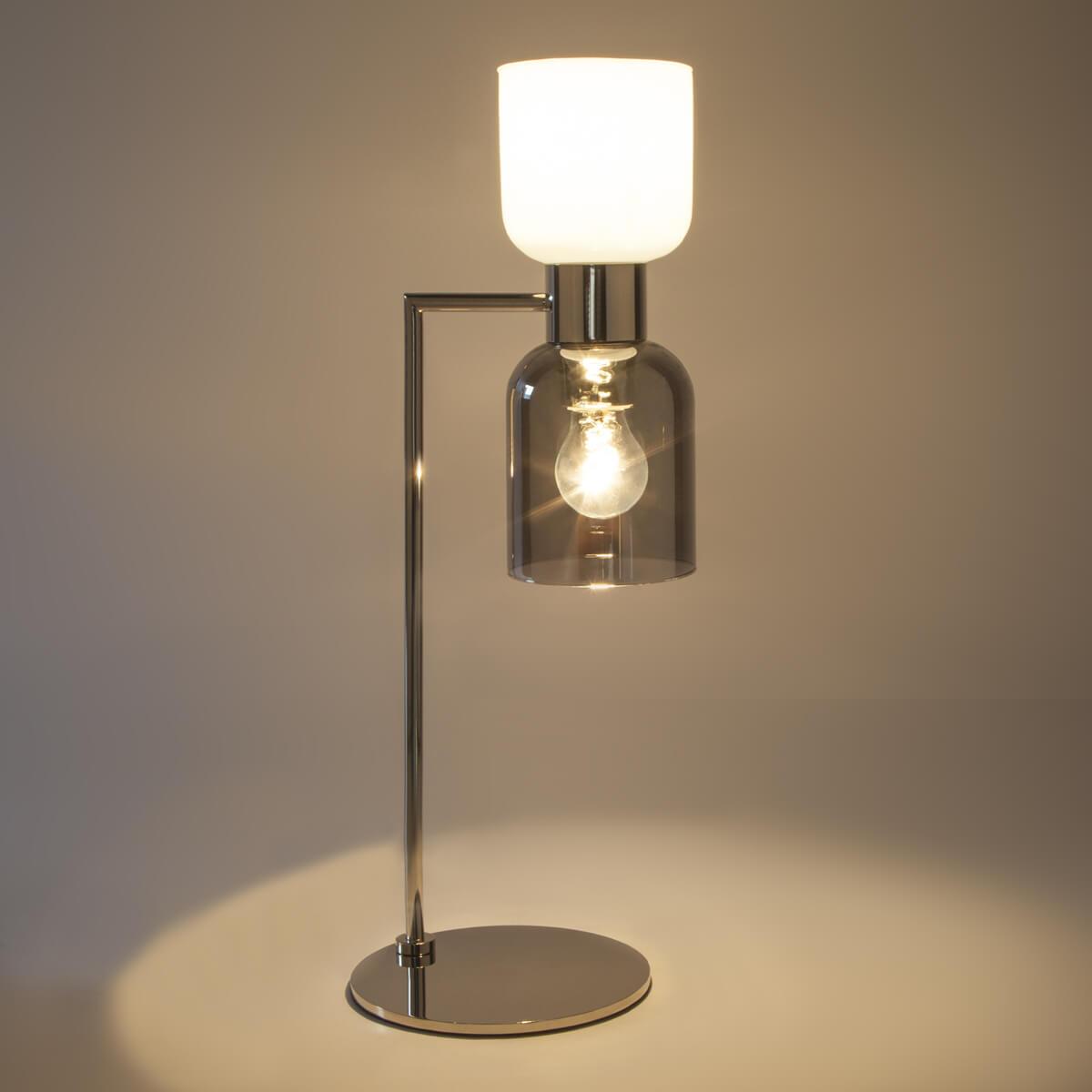 Настольная лампа Eurosvet Tandem 01084/2 никель от Китайского бренда из коллекции Tandem ) подходит для установки на стол в спальни в современном стиле. Лампа из металлической основы - цвета никель и плафонами из стекла в форме - дымчатого цвета.