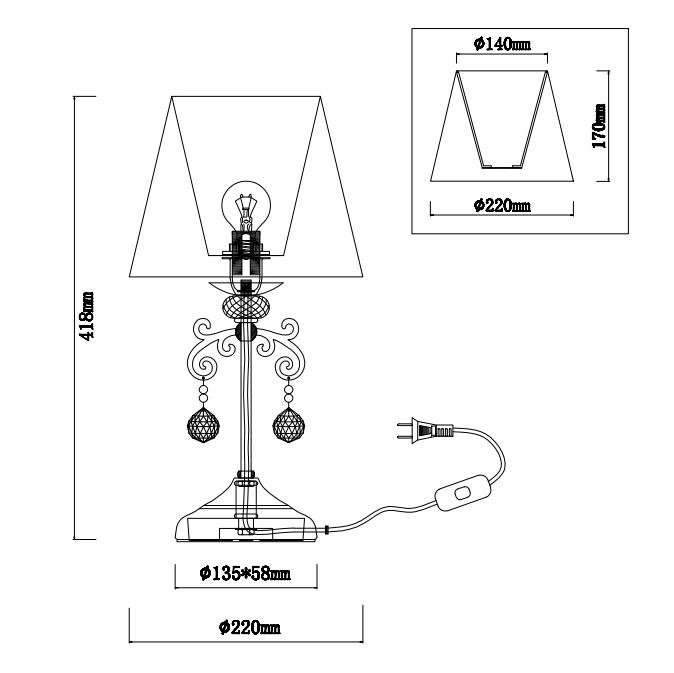Для лампы необходима 1 лампа накаливания 40 W и цоколем E14. Лампы приобретаются отдельно. Габариты изделия: высота – 420 мм, диаметр – 220 мм.