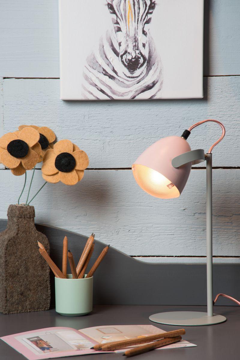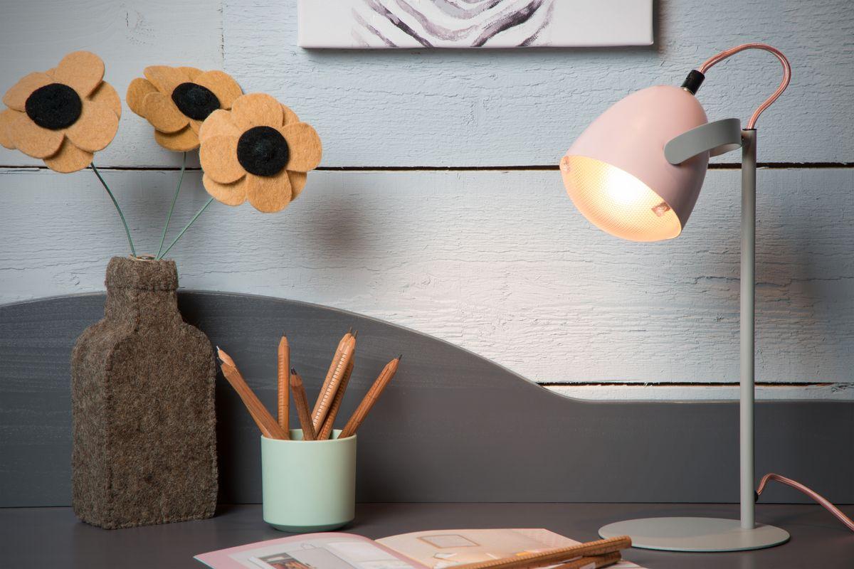 Настольная лампа Lucide Dylan 05537/01/66 от Китайского бренда Lucide из коллекции Dylan ) подходит для установки на стол в детской в скандинавском стиле. Лампа из стальной основы - серого цвета и плафонами из металла в форме овала - розового цвета.