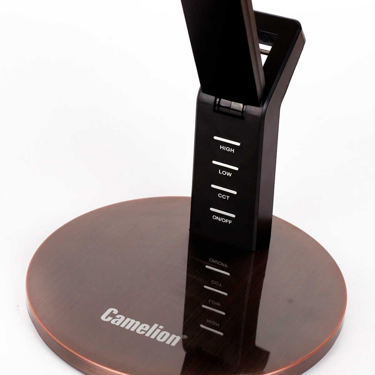Настольная лампа Camelion KD-835 C28 12999 от Китайского бренда из коллекции ) подходит для установки на стол в современном стиле. Лампа из пластиковой основы - черного цвета и плафонами из пластика в форме - бронзового цвета.