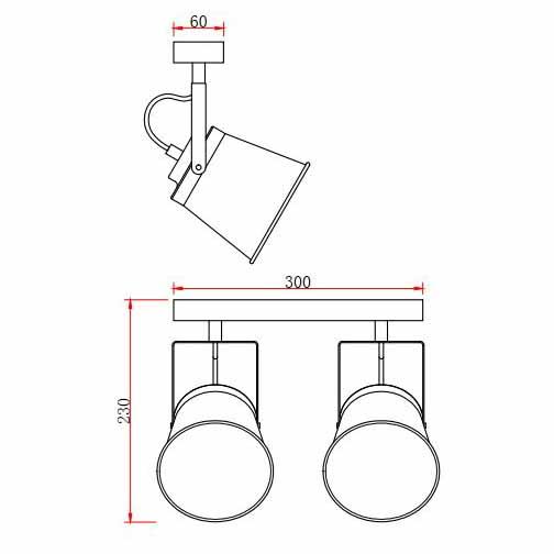 Для спота необходима 2 лампы накаливания 40 W и цоколем E27. Габариты изделия: высота – 230 мм, диаметр – мм.