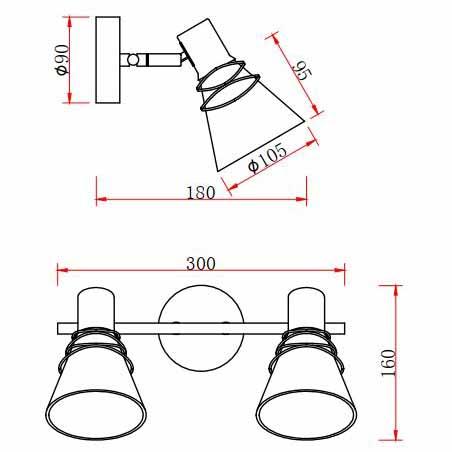 Для спота необходима 2 лампы накаливания 40 W и цоколем E14. Габариты изделия: высота – 180 мм, диаметр – мм.