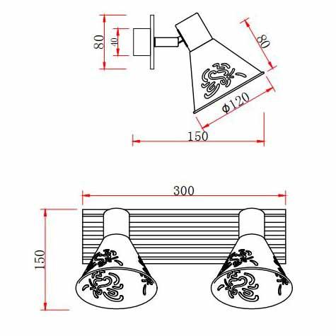 Для спота необходима 2 лампы накаливания 40 W и цоколем E14. Габариты изделия: высота – 150 мм, диаметр – мм.