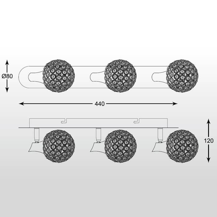 Для спота необходима 3 галогеновые лампы 40 W и цоколем G9. Габариты изделия: высота – 120 мм, диаметр – 80 мм.