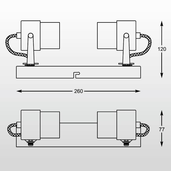 Для спота необходима 2 галогеновые лампы 40 W и цоколем GU10. Габариты изделия: высота – 120 мм, диаметр – мм.