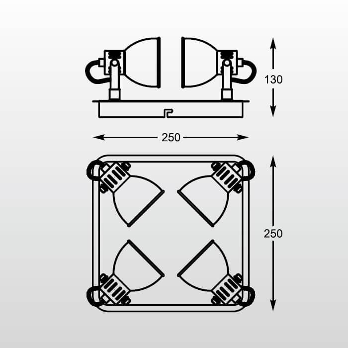 Для спота необходима 4 галогеновые лампы 40 W и цоколем GU10. Габариты изделия: высота – 130 мм, диаметр – мм.
