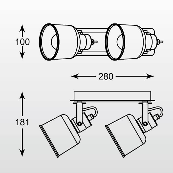 Для спота необходима 2 лампы накаливания 40 W и цоколем E14. Габариты изделия: высота – 181 мм, диаметр – 100 мм.
