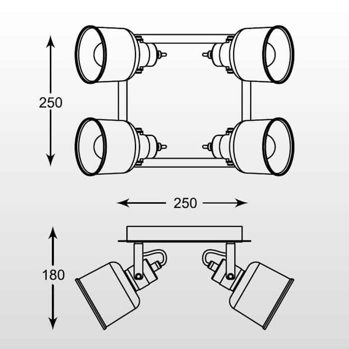 Для спота необходима 4 лампы накаливания 40 W и цоколем E14. Габариты изделия: высота – 180 мм, диаметр – мм.