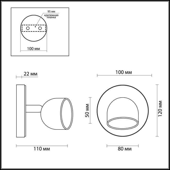 Для спота необходима светодиодных ламп 6 W и цоколем LED. Габариты изделия: высота – 120 мм, диаметр – мм.