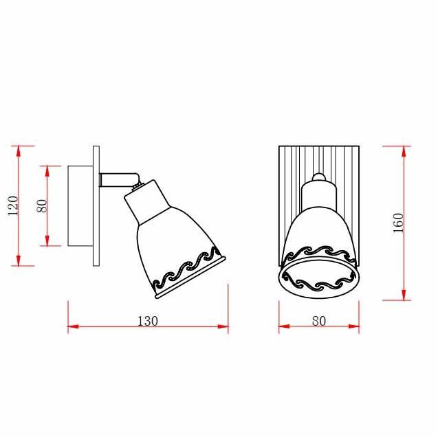 Для спота необходима 1 лампа накаливания 40 W и цоколем E14. Габариты изделия: высота – 160 мм, диаметр – мм.