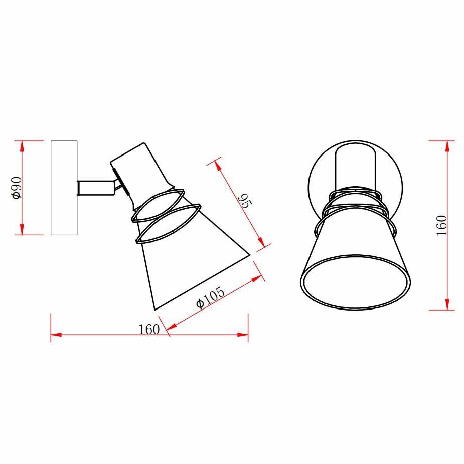 Для спота необходима 1 лампа накаливания 40 W и цоколем E14. Габариты изделия: высота – 160 мм, диаметр – мм.