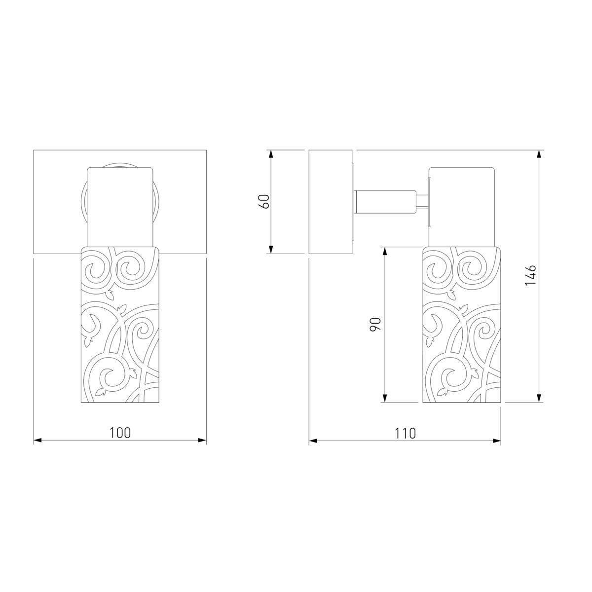 Для спота необходима 1 лампа накаливания 40 W и цоколем E14. Габариты изделия: высота – 170 мм, диаметр – мм.