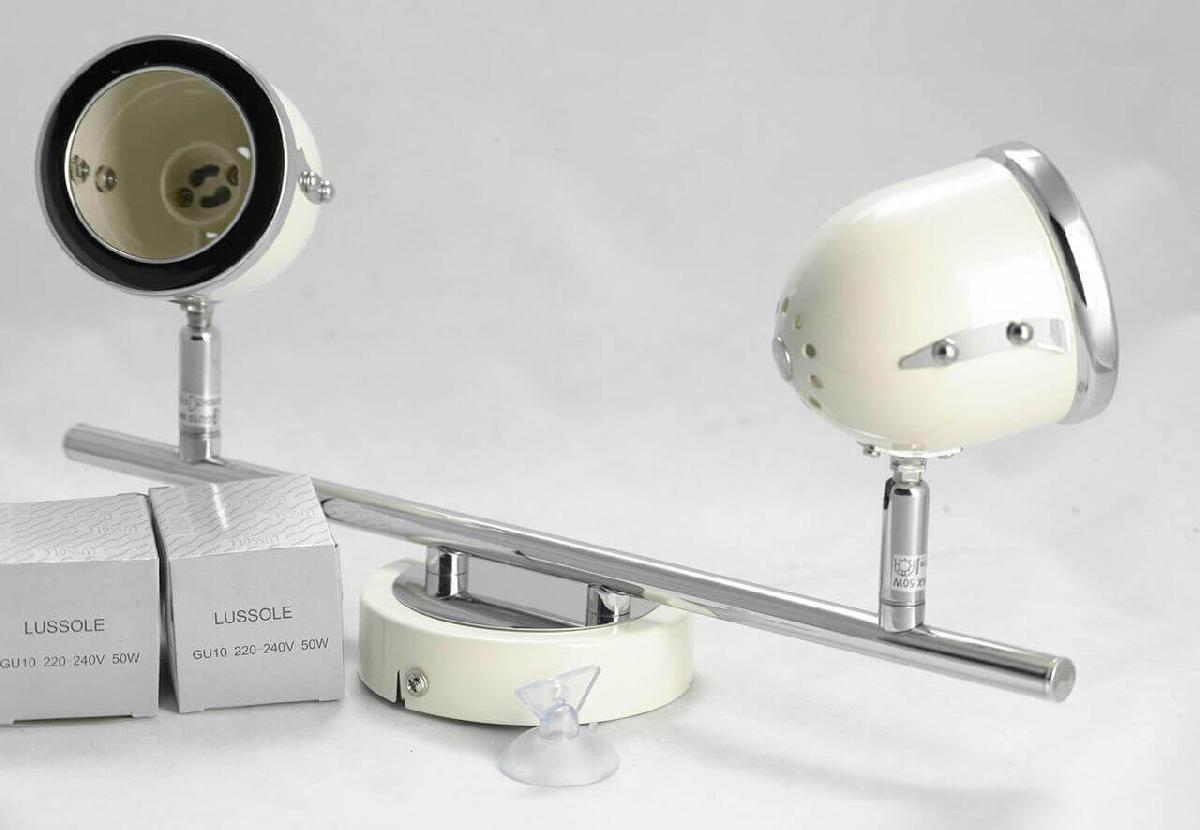 Для спота необходима 2 галогеновые лампы 50 W и цоколем GU10. Габариты изделия: высота – 190 мм, диаметр – мм.