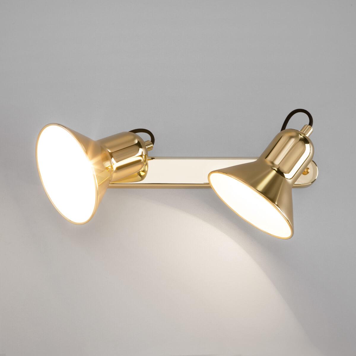 Настенный светильник Eurosvet 20082/2 золото от Российского бренда Eurosvet из коллекции Canotier предназначен для установки в кухне на стену в хай-тек стиле. Спот с металлической арматурой залотого цвета и залотого цвета плафонами из металла, формы конуса предназначен для освещения 3 м2.