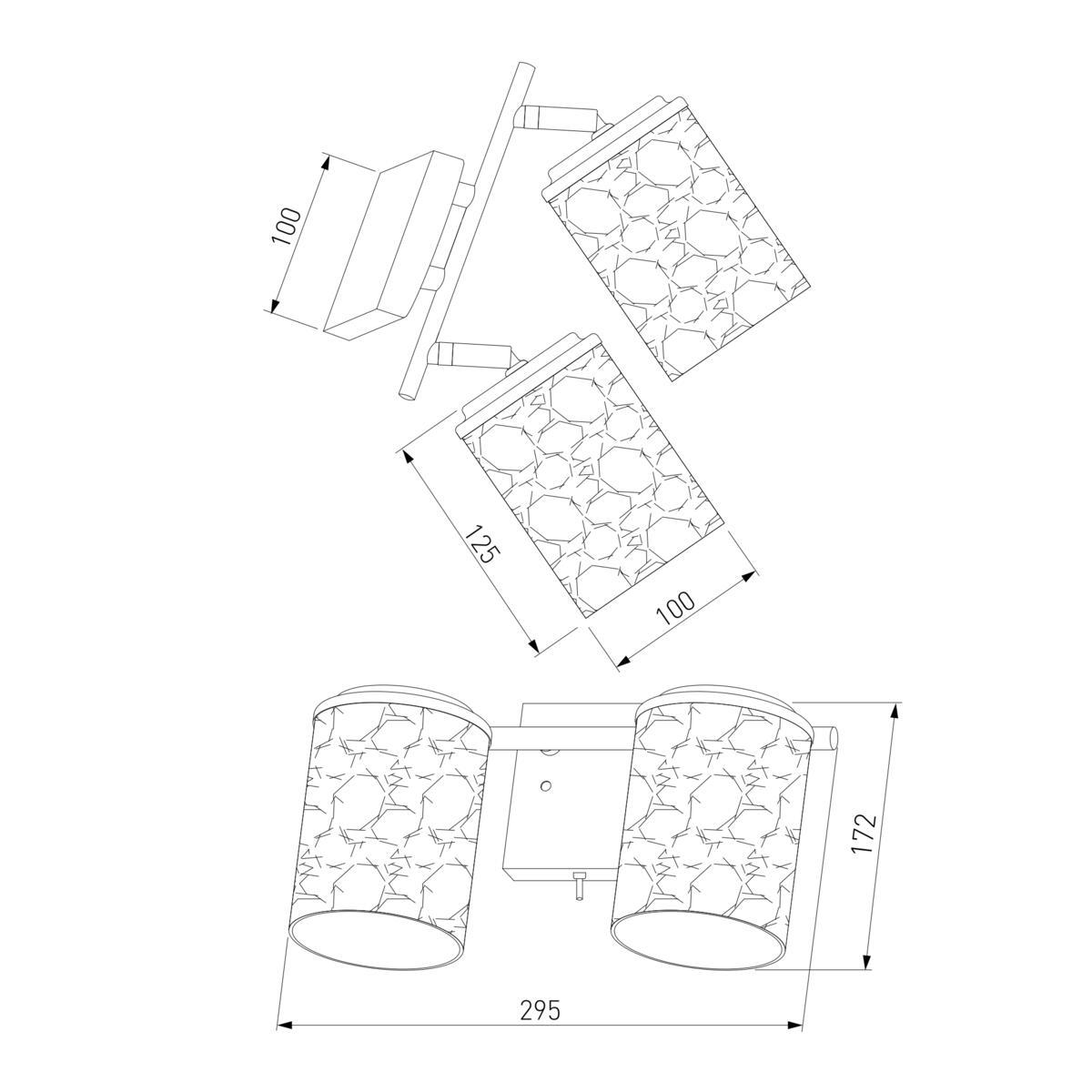 Для спота необходима 2 галогеновые лампы 60 W и цоколем E14. Габариты изделия: высота – 172 мм, диаметр – мм.