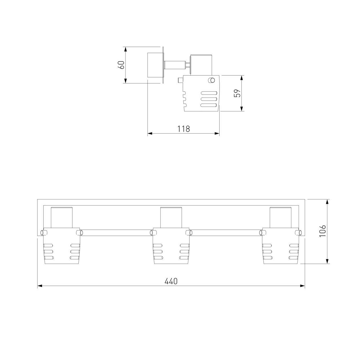 Для спота необходима 3 галогеновые лампы 50 W и цоколем G5.3. Габариты изделия: высота – 150 мм, диаметр – мм.