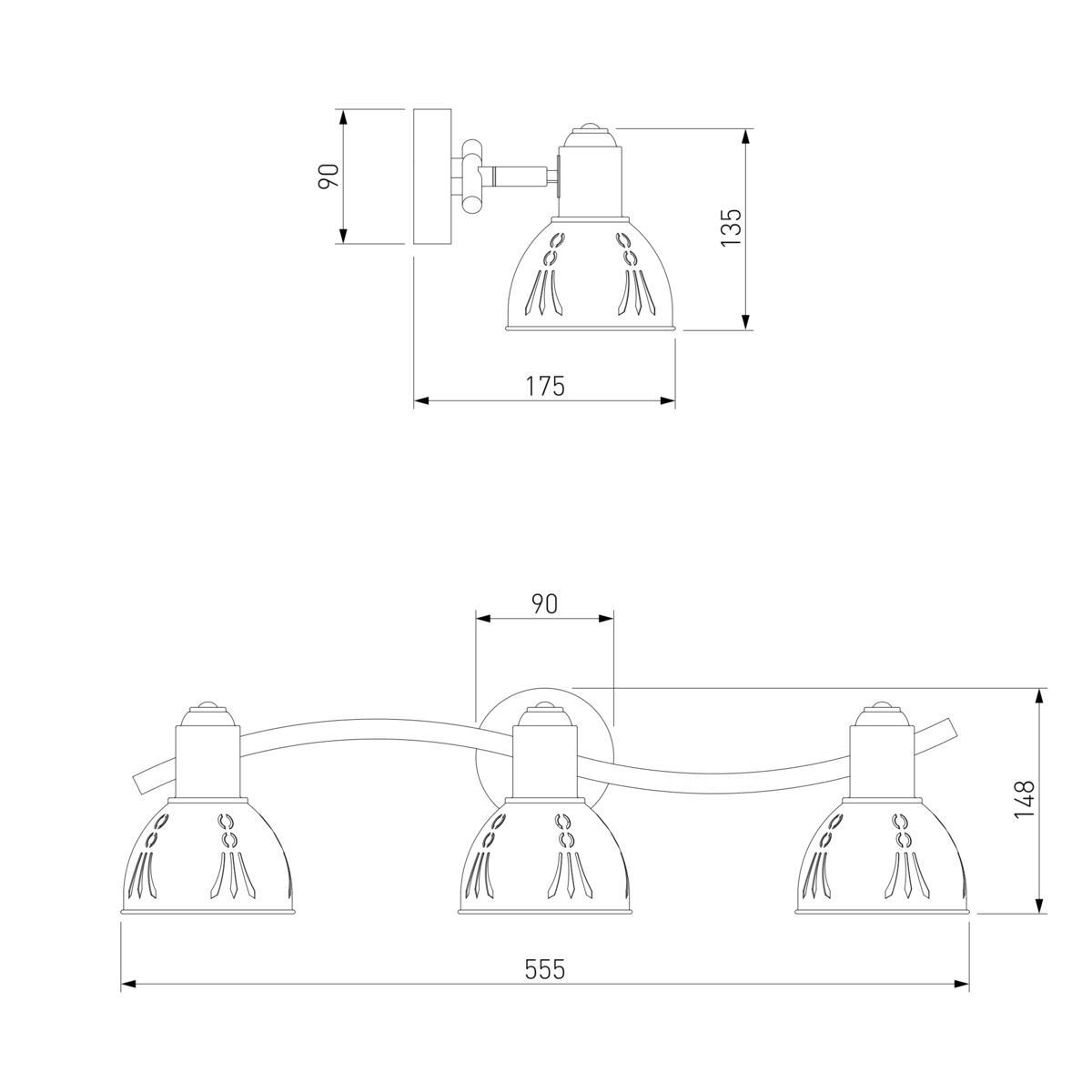 Для спота необходима 3 лампы накаливания 40 W и цоколем E14. Габариты изделия: высота – 150 мм, диаметр – мм.