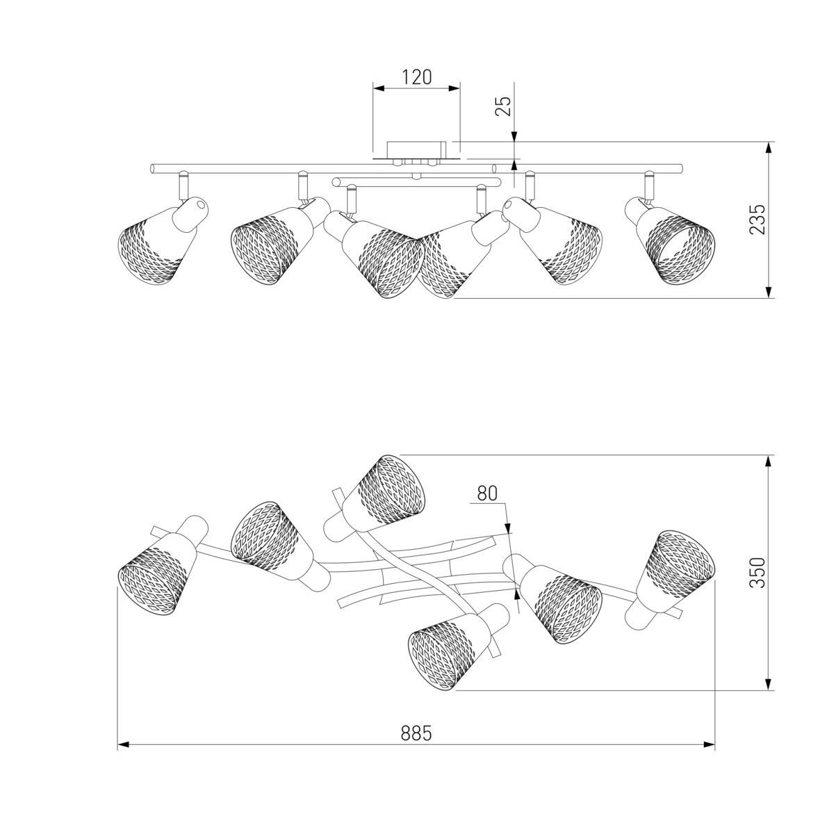 Для спота необходима 6 ламп накаливания 40 W и цоколем E14. Габариты изделия: высота – 190 мм, диаметр – мм.