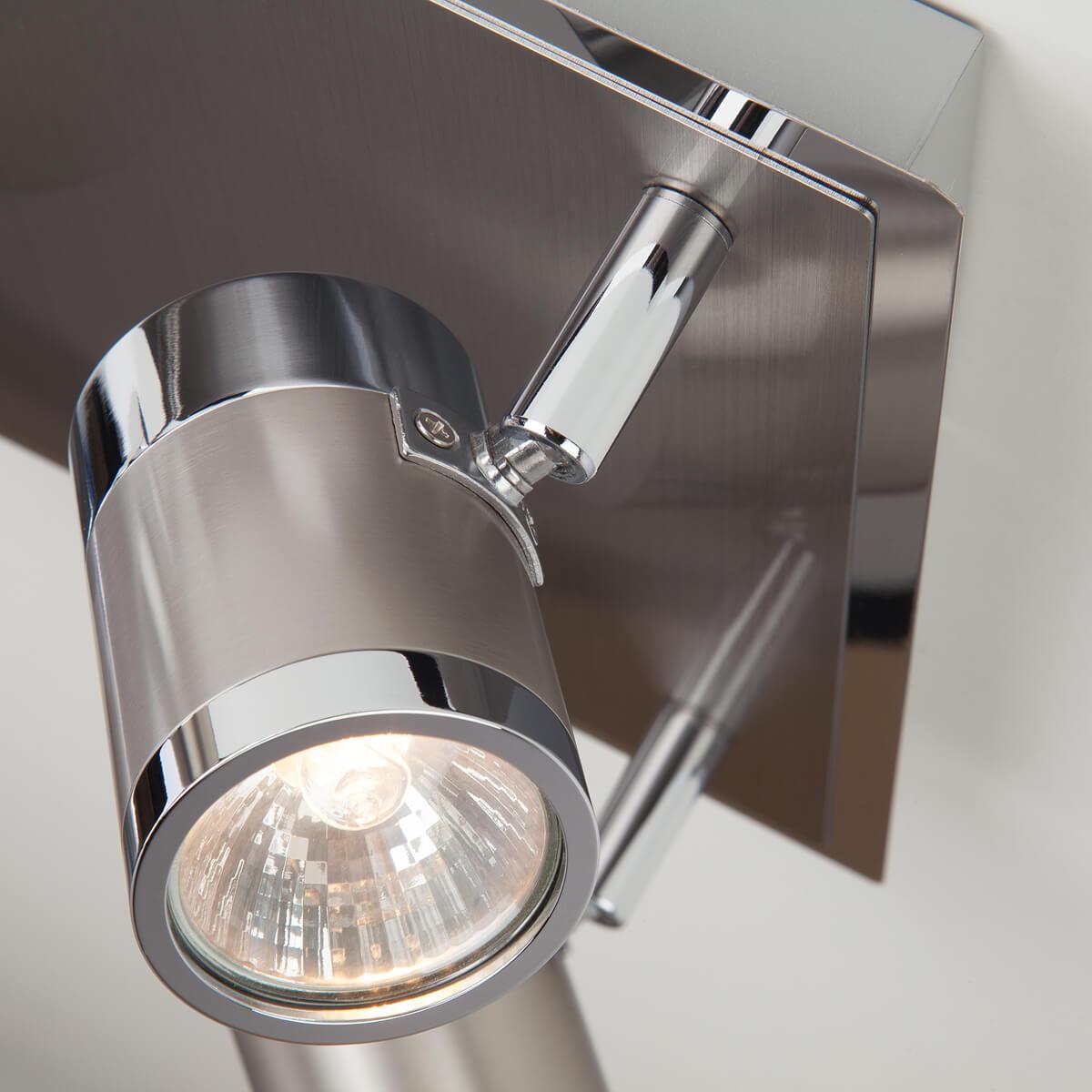 Для спота необходима 4 галогеновые лампы 50 W и цоколем GU10. Габариты изделия: высота – 135 мм, диаметр – мм.