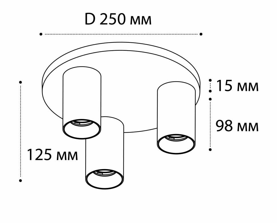 Для спота необходима 3 светодиодные лампы 9 W и цоколем GU10. Габариты изделия: высота – 125 мм, диаметр – 250 мм.
