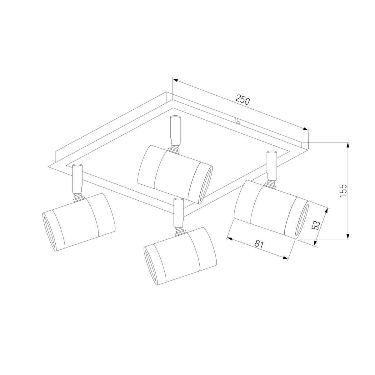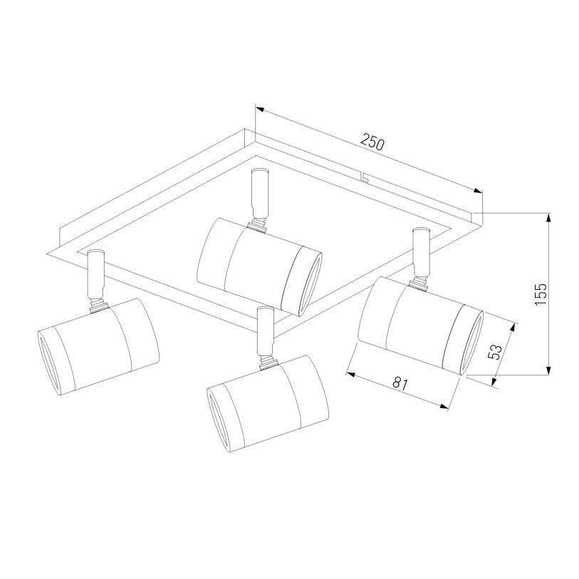 Для спота необходима 4 галогеновые лампы 50 W и цоколем GU10. Габариты изделия: высота – 155 мм, диаметр – мм.