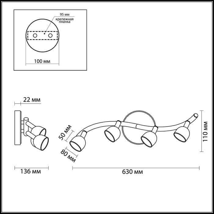 Для спота необходима светодиодных ламп 6 W и цоколем LED. Габариты изделия: высота – 110 мм, диаметр – мм.