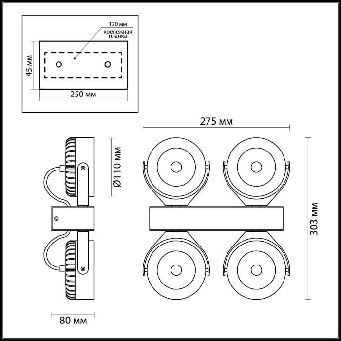 Для спота необходима светодиодных ламп 10 W и цоколем LED. Габариты изделия: высота – 80 мм, диаметр – мм.