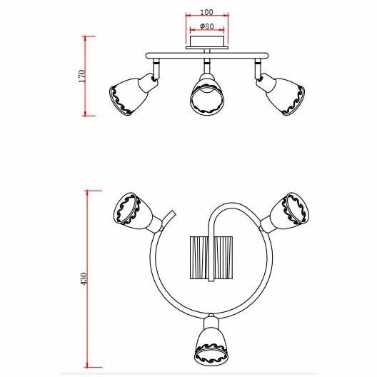 Для спота необходима 3 лампы накаливания 40 W и цоколем E14. Габариты изделия: высота – 170 мм, диаметр – 430 мм.