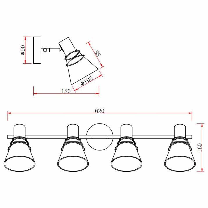 Для спота необходима 4 лампы накаливания 40 W и цоколем E14. Габариты изделия: высота – 180 мм, диаметр – мм.