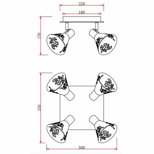 Для спота необходима 4 лампы накаливания 40 W и цоколем E14. Габариты изделия: высота – 170 мм, диаметр – мм.