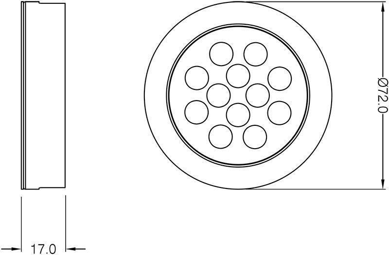 Для светильника необходима светодиодных ламп 2 W. Габариты изделия: высота – 17 мм, диаметр – 72 мм.