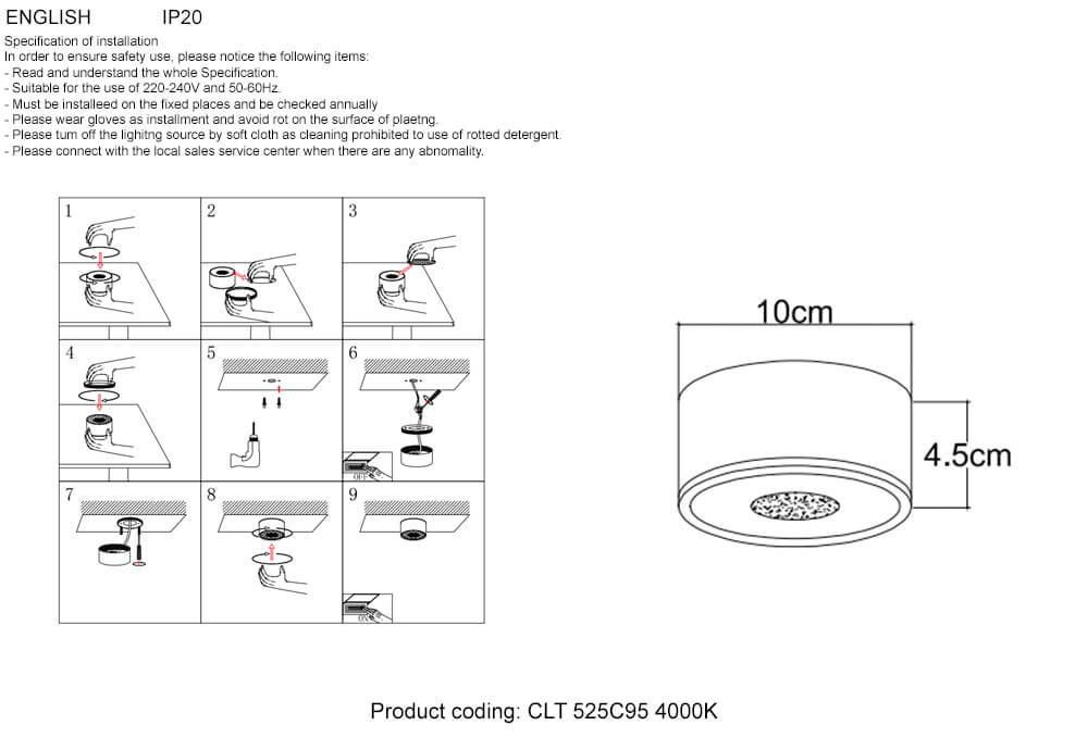 Для светильника необходима светодиодных ламп 10 W. Габариты изделия: высота – 45 мм, диаметр – 100 мм.