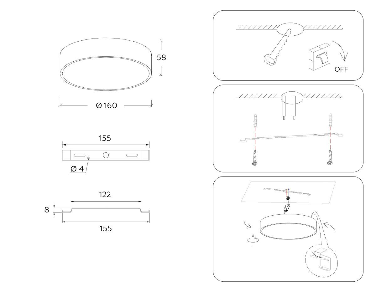 Для светильника необходима светодиодных ламп 18 W. Габариты изделия: высота – 58 мм, диаметр – 160 мм.