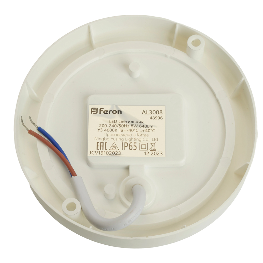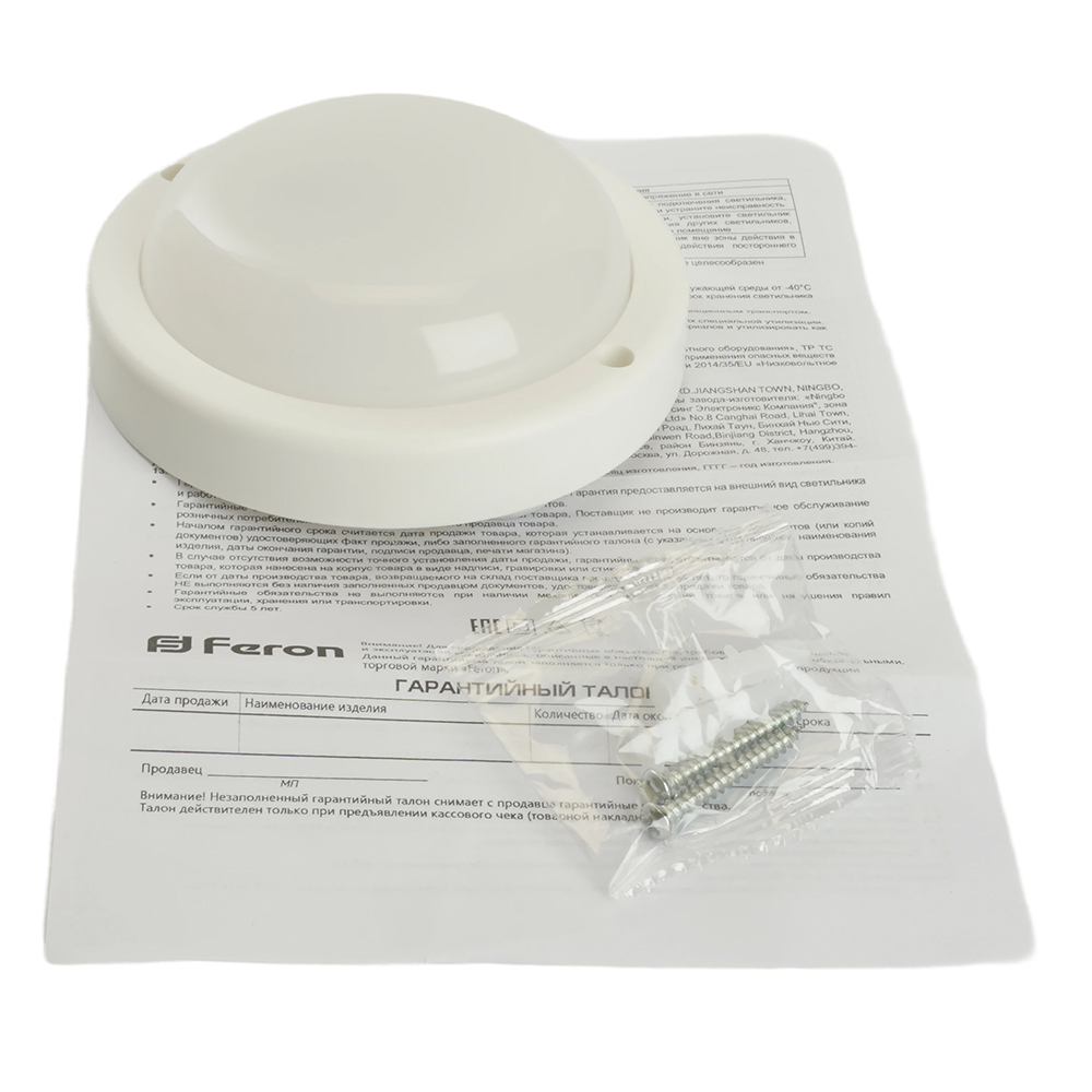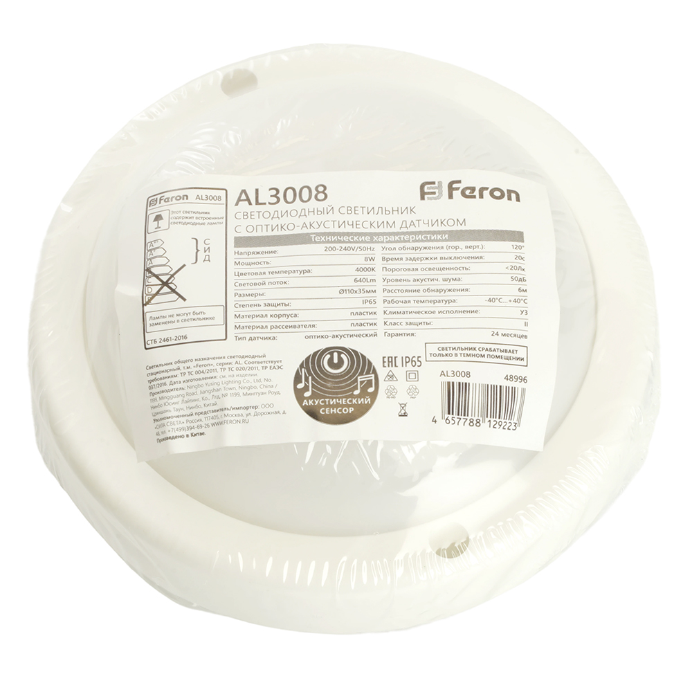 Светильник светодиодный пылевлагозащищённый с оптико- акустическим датчиком Feron AL3008 в пластиковом корпусе 8W 4000K 220V IP65 белый 48996 от бренда из коллекции предназначен для установки в . Cветильник в форме с пластиковой арматурой белого цвета и плафонами из предназначен для освещения м2.