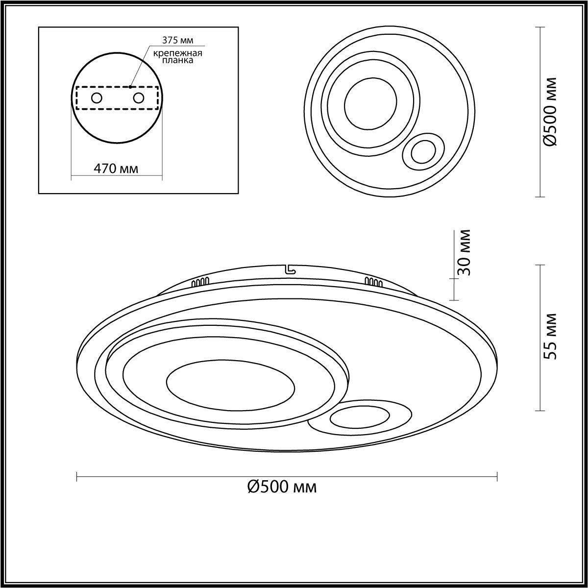 Для светильника необходима светодиодных ламп 85 W. Габариты изделия: высота – 55 мм, диаметр – 500 мм.