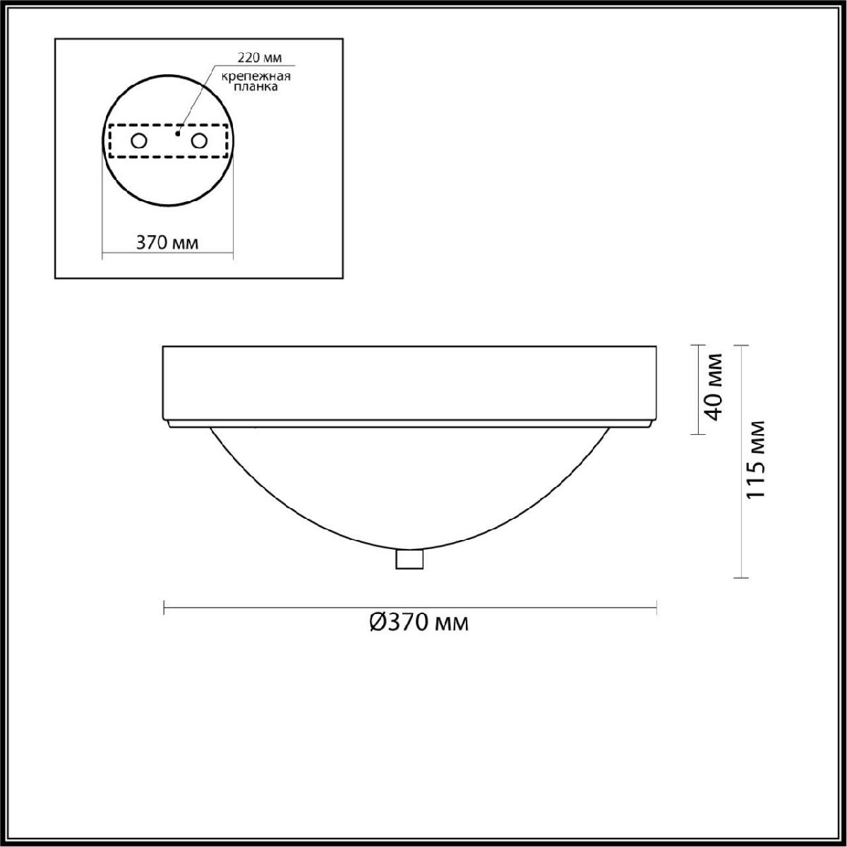 Для светильника необходима 3 лампы накаливания 60 W. Габариты изделия: высота – 115 мм, диаметр – 370 мм.