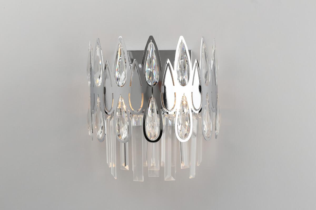 Настенный светильник Omnilux Riposto OML-71701-02 от Китайского бренда Omnilux из коллекции Riposto предназначен для установки на стену в спальни в классиком стиле. Cветильник в форме цилиндра с металлической арматурой цвет хрома и прозрачного цвета плафонами из хрусталя предназначен для освещения 4 м2.
