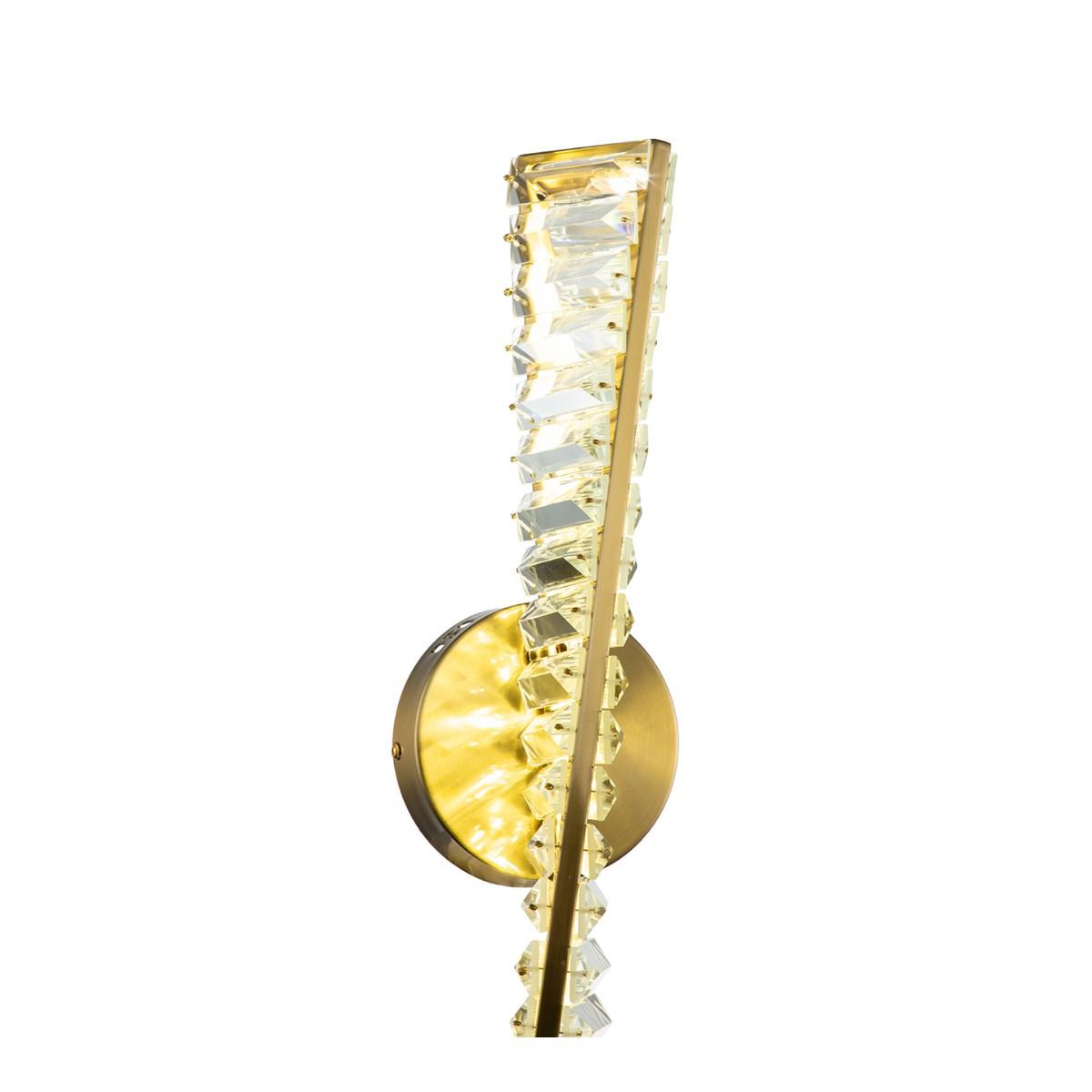 Настенный светодиодный светильник Indigo FRIZZANTE 12015/1W Brass V000042L от Китайского бренда из коллекции FRIZZANTE предназначен для установки на стену в спальни в . Cветильник в форме с металлической арматурой бронзового цвета и прозрачного цвета плафонами из хрусталя предназначен для освещения 3 м2.