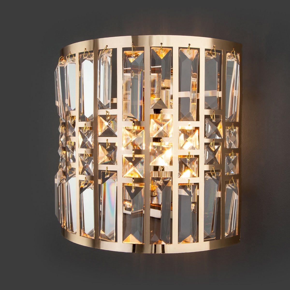 Настенный светильник Eurosvet Lory 10125/2 золото/прозрачный хрусталь Strotskis (10116/2) от Китайского бренда из коллекции Lory предназначен для установки на стену в спальни в стиле Арт-деко. Cветильник в форме с металлической арматурой залотого цвета и прозрачного цвета плафонами из хрусталя предназначен для освещения 3 м2.