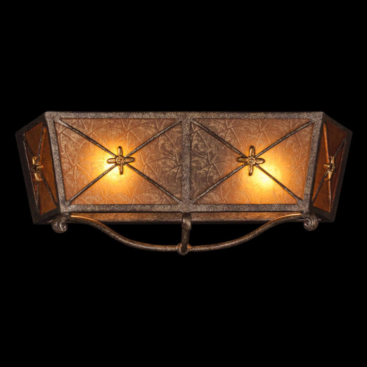 Настенный светильник Chiaro Айвенго 382022002 от Немецкого бренда Chiaro из коллекции Айвенго предназначен для установки на стену в гостиной в замковом стиле. Cветильник в форме трапеции с металлической арматурой бронзового цвета и коричневого цвета плафонами из стекла предназначен для освещения 6,7 м2.