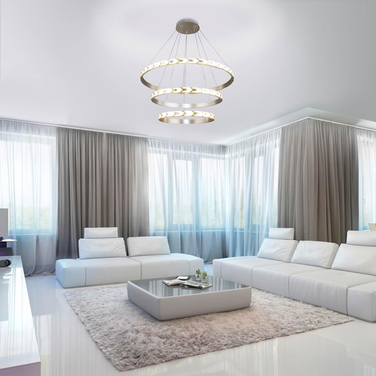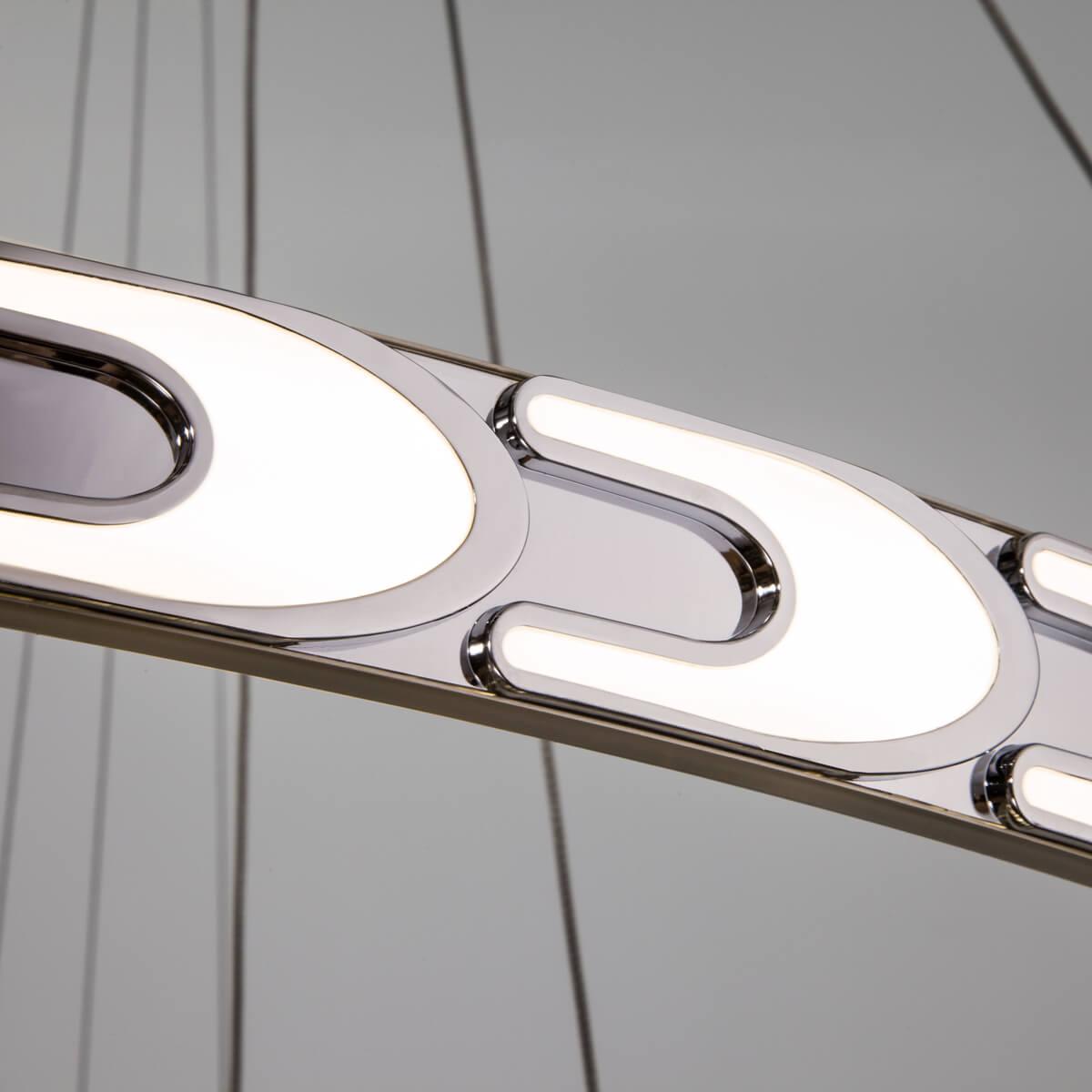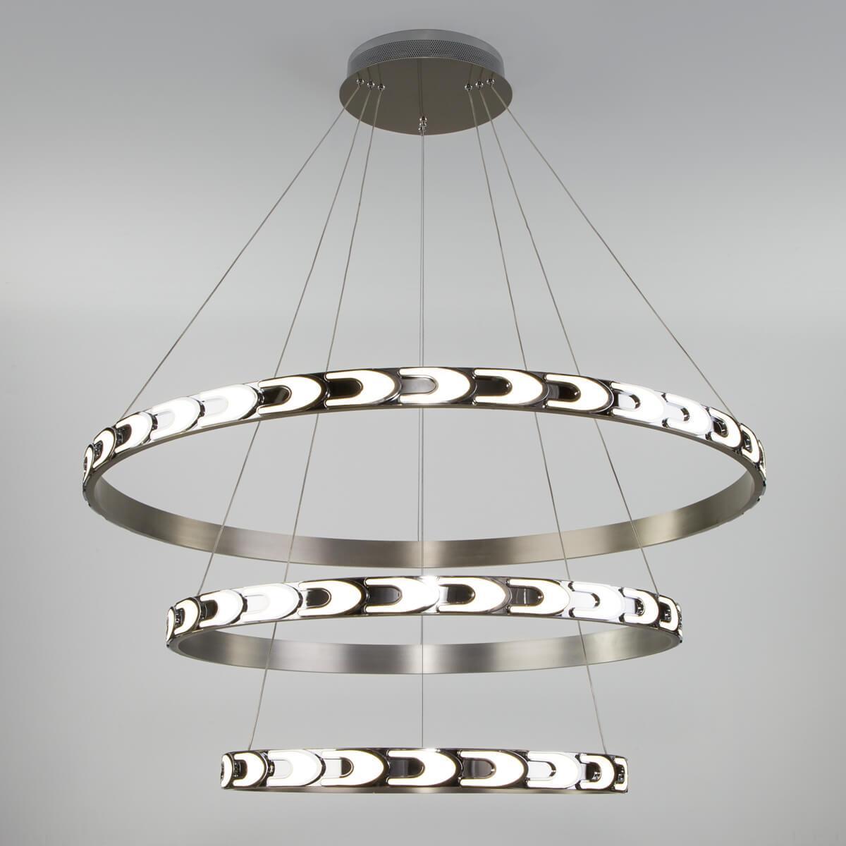 Светодиодный светильник Eurosvet с пультом управления 90163/3 сатин-никель от Китайского бренда Eurosvet из коллекции Chain предназначен для установки на потолок в больших залах в современном стиле. Cветильник в форме с металлической арматурой цвета никель и цвета никель плафонами из металла предназначен для освещения м2.