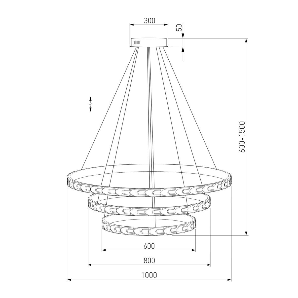 Для светильника необходима светодиодных ламп 160 W. Габариты изделия: высота – 600 мм, диаметр – 1050 мм.