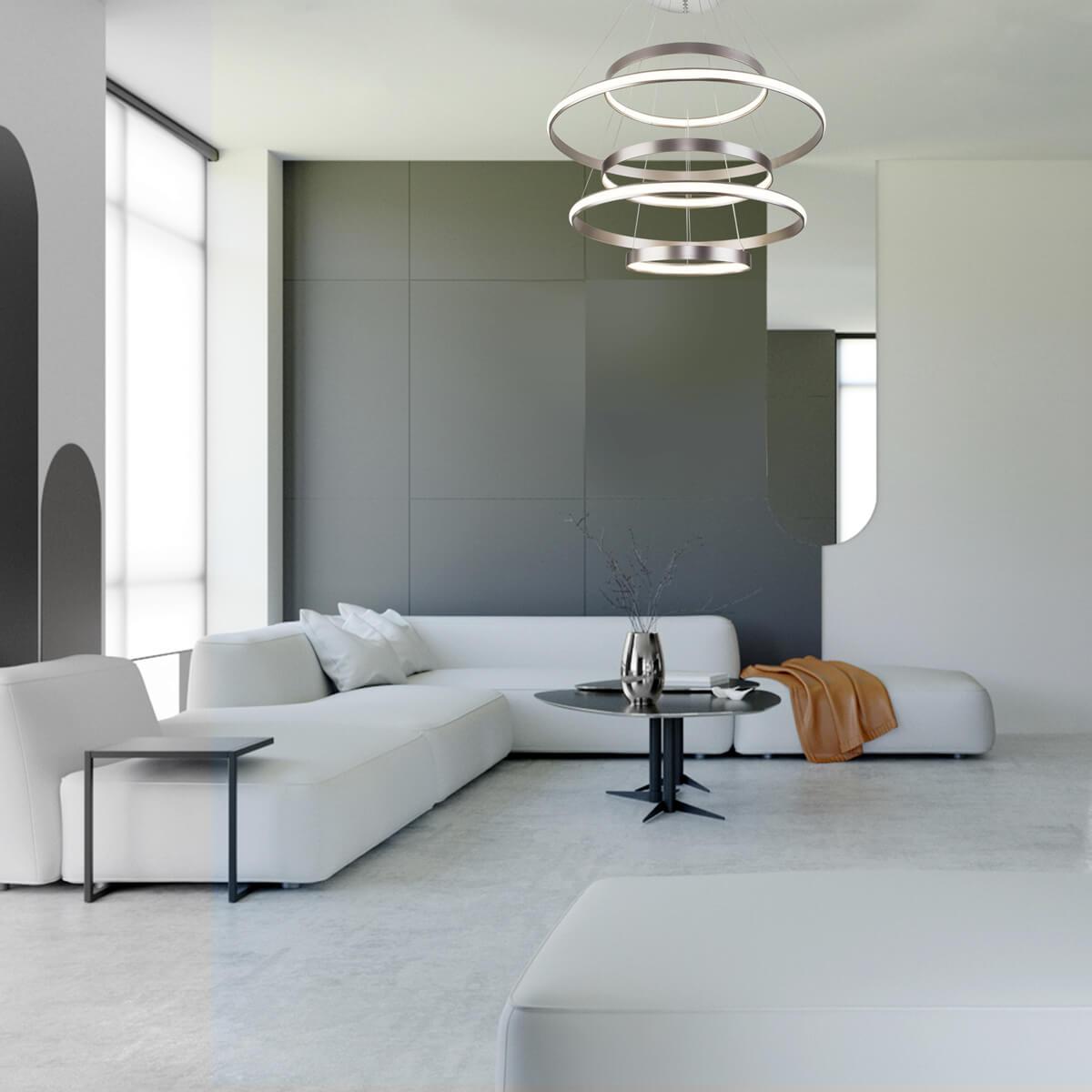 Подвесной светильник Eurosvet 90179/5 сатин-никель от бренда Eurosvet из коллекции Olympia предназначен для установки на потолок в больших залах в хай-тек стиле. Cветильник в форме с металлической арматурой цвета никель и цвета никель плафонами из металла предназначен для освещения м2.