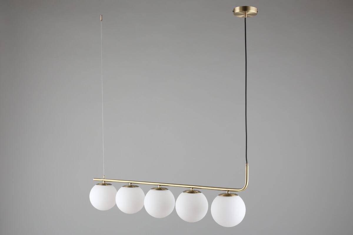 Подвесной светильник Omnilux Avetrana OML-66613-05 от Китайского бренда Omnilux из коллекции Avetrana предназначен для установки на потолок в кухне в стиле модерн. Cветильник в форме шара с металлической арматурой бронзового цвета и белого цвета плафонами из стекла предназначен для освещения 12 м2.