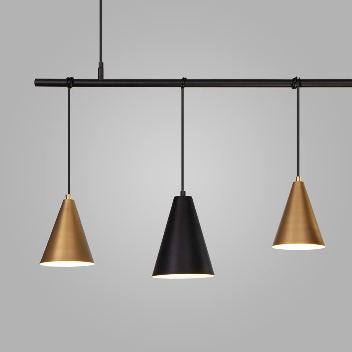 Подвесной светильник Eurosvet Castle 50088/5 черный/золото от Китайского бренда Eurosvet из коллекции Castle предназначен для установки на потолок в кухне в скандинавском стиле. Cветильник в форме конуса с металлической арматурой черного цвета и залотого цвета плафонами из металла предназначен для освещения 16 м2.