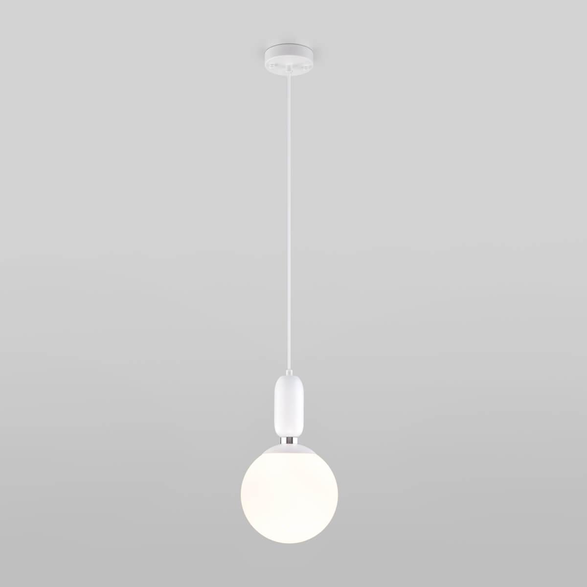Подвесной светильник Eurosvet Bubble 50197/1 белый от Китайского бренда Eurosvet из коллекции Bubble предназначен для установки на потолок в кухне в скандинавском стиле. Cветильник в форме шара с металлической арматурой белого цвета и белого цвета плафонами из стекла предназначен для освещения 3 м2.
