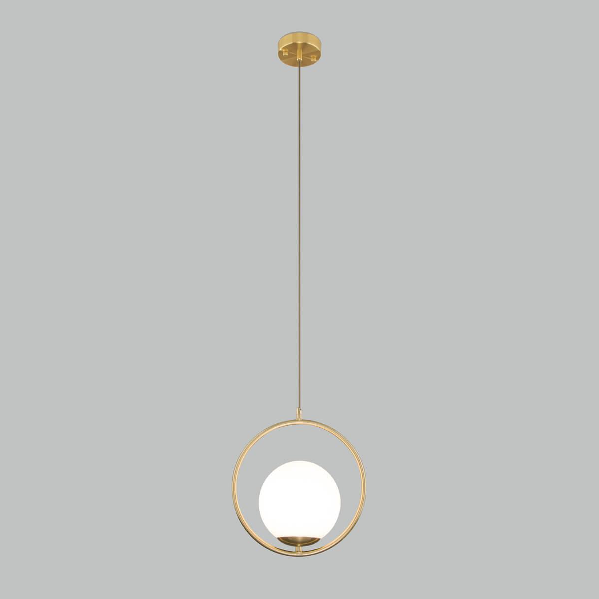 Подвесной светильник Eurosvet Ringo 50089/1 золото от Китайского бренда Eurosvet из коллекции Ringo предназначен для установки на потолок в кухне в скандинавском стиле. Cветильник в форме шара с металлической арматурой залотого цвета и белого цвета плафонами из стекла предназначен для освещения 3 м2.