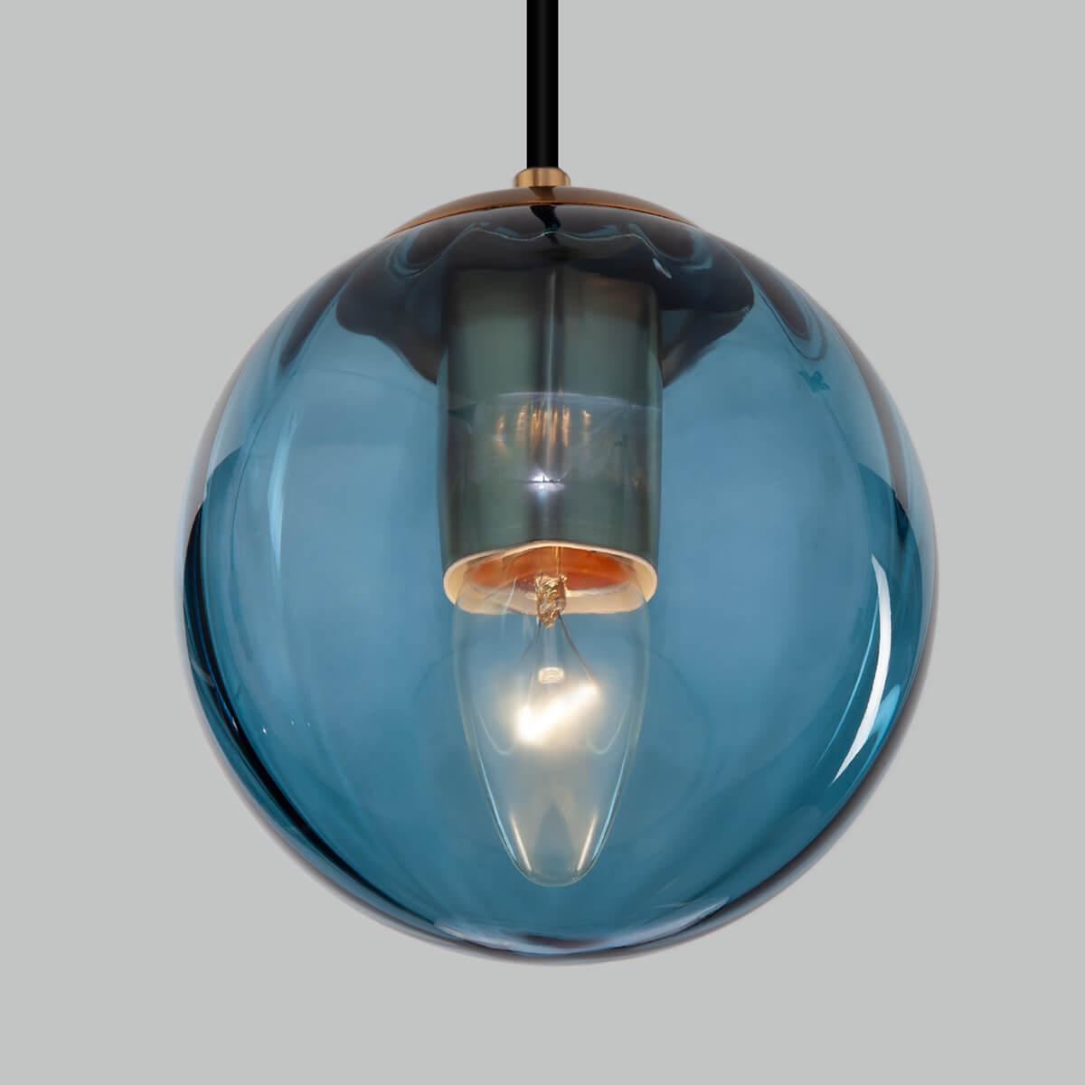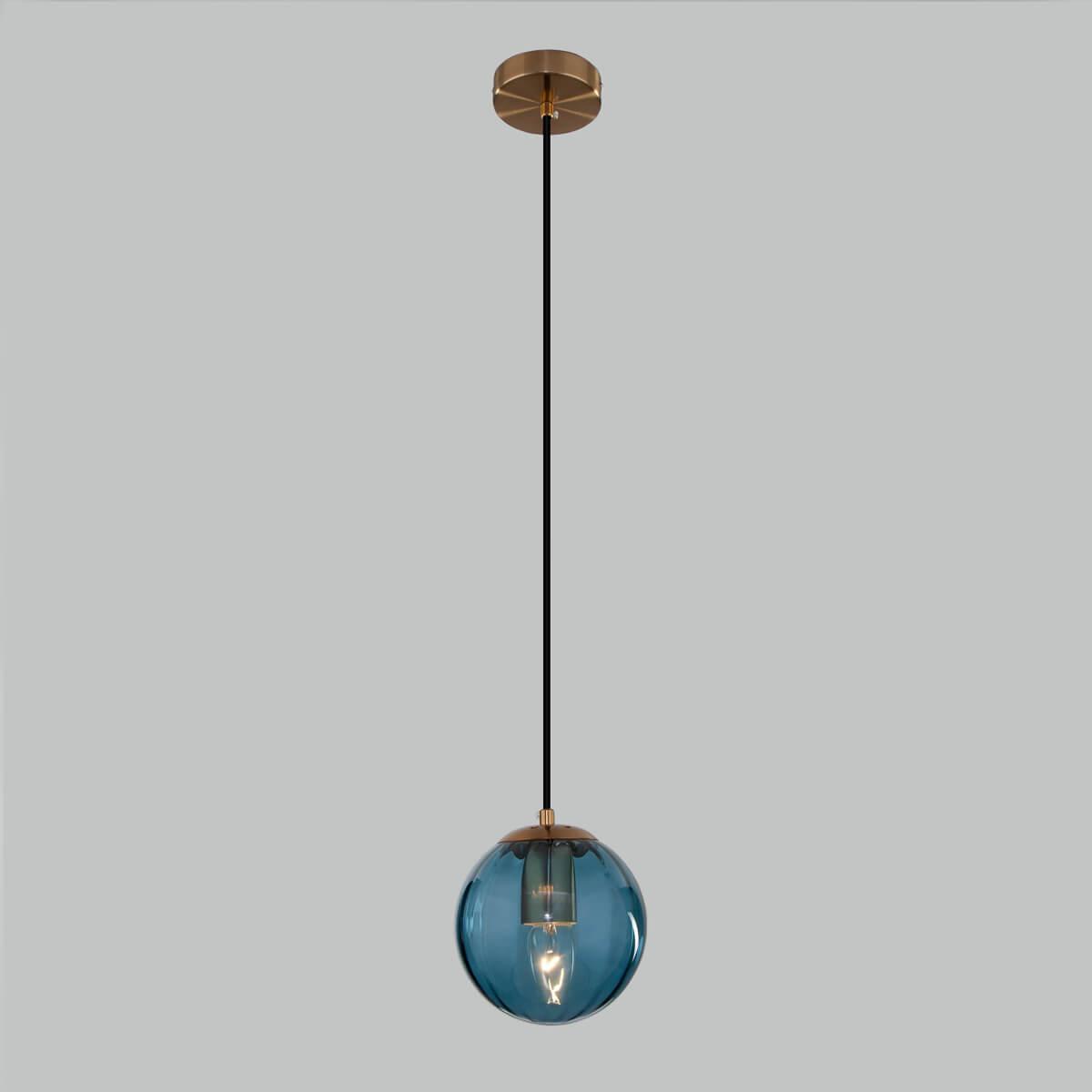 Подвесной светильник Eurosvet Juno 50207/1 синий от Китайского бренда Eurosvet из коллекции Juno предназначен для установки на потолок в кухне в современном стиле. Cветильник в форме шара с металлической арматурой бронзового цвета и синего цвета плафонами из стекла предназначен для освещения 2,2 м2.