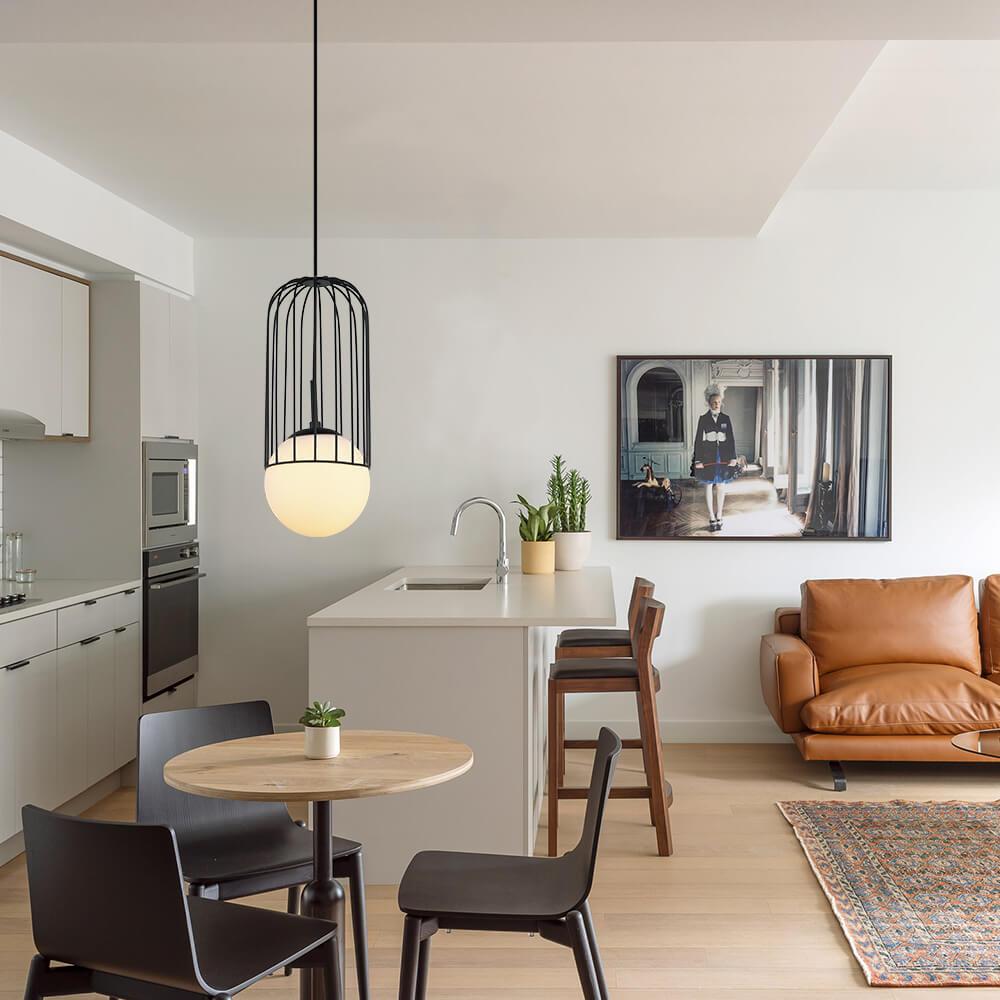 Подвесной светильник Lumien Hall Тури LH4115/1P-BK от Испанского бренда Lumien Hall из коллекции Turi предназначен для установки на потолок в кухне в лофт стиле. Cветильник в форме шара с металлической арматурой черного цвета и белого цвета плафонами из стекла предназначен для освещения 2,2 м2.